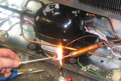 • Монтаж нового мотора. Мастер закрепит мотор в корпусе и состыкует все трубки холодильника (всасывающую, отсасывающую и заправочную) с соответствующими патрубками на компрессоре. Затем запаяет места состыковок трубок с мотором.