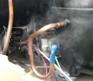 | Если холодильник дымит или от него пахнет горелым, а задняя стенка очень сильно нагревается – вероятно, проблема в поломке мотора-компрессора. Как правило, при этом мотор холодильника включается и тут же выключается, перед выключением слышен характерный щелчок – срабатывает пускозащитное реле. Корпус самого мотора обычно сильно горячий. Если холодильник однокомпрессорный – не холодят оба отделения, если двухкомпрессорный – только одно из. Возможно, что в квартире «выбивает» пробки. |
